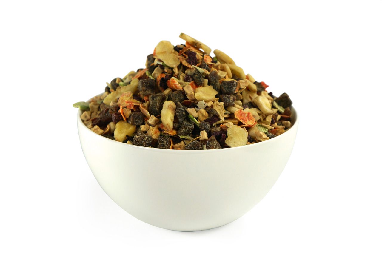 Il supplemento alimentare si distingue per la ricetta dal gusto squisito. Fiocchi di carota, carruba, fiocchi di patata, pellet di erba medica, fiocchi di piselli, barbabietola rossa, porro e prezzemolo si fondono in un mix armonioso. Ananas, albicocche, datteri, banane e mirtilli rossi costituiscono la parte di frutta.