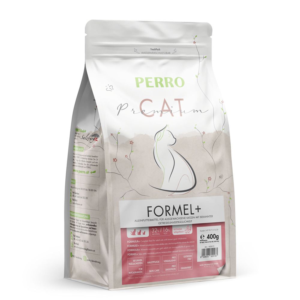 PERRO Cat Premium Formel+ è 100% senza cereali ed è stato sviluppato appositamente per gatti con intolleranze ai cereali. Con un’elevata percentuale di carne fresca di pollame, viene accettato al meglio anche dai gatti più schizzinosi.