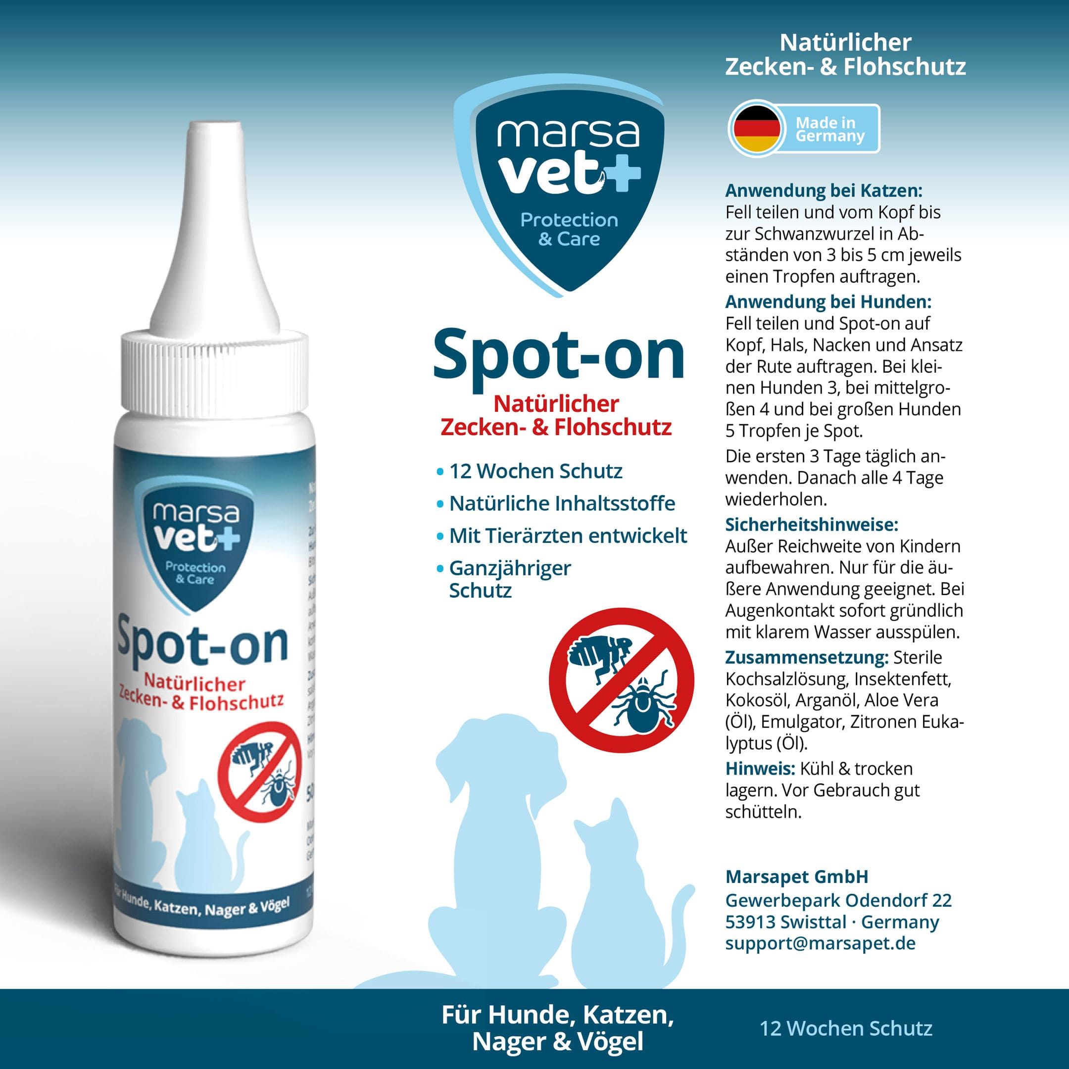 - Utilizzabile tutto l'anno: Grazie alla sua formula naturale, la protezione da zecche e pulci di Marsavet può essere utilizzata senza problemi per tutto l'anno, garantendo una protezione duratura.