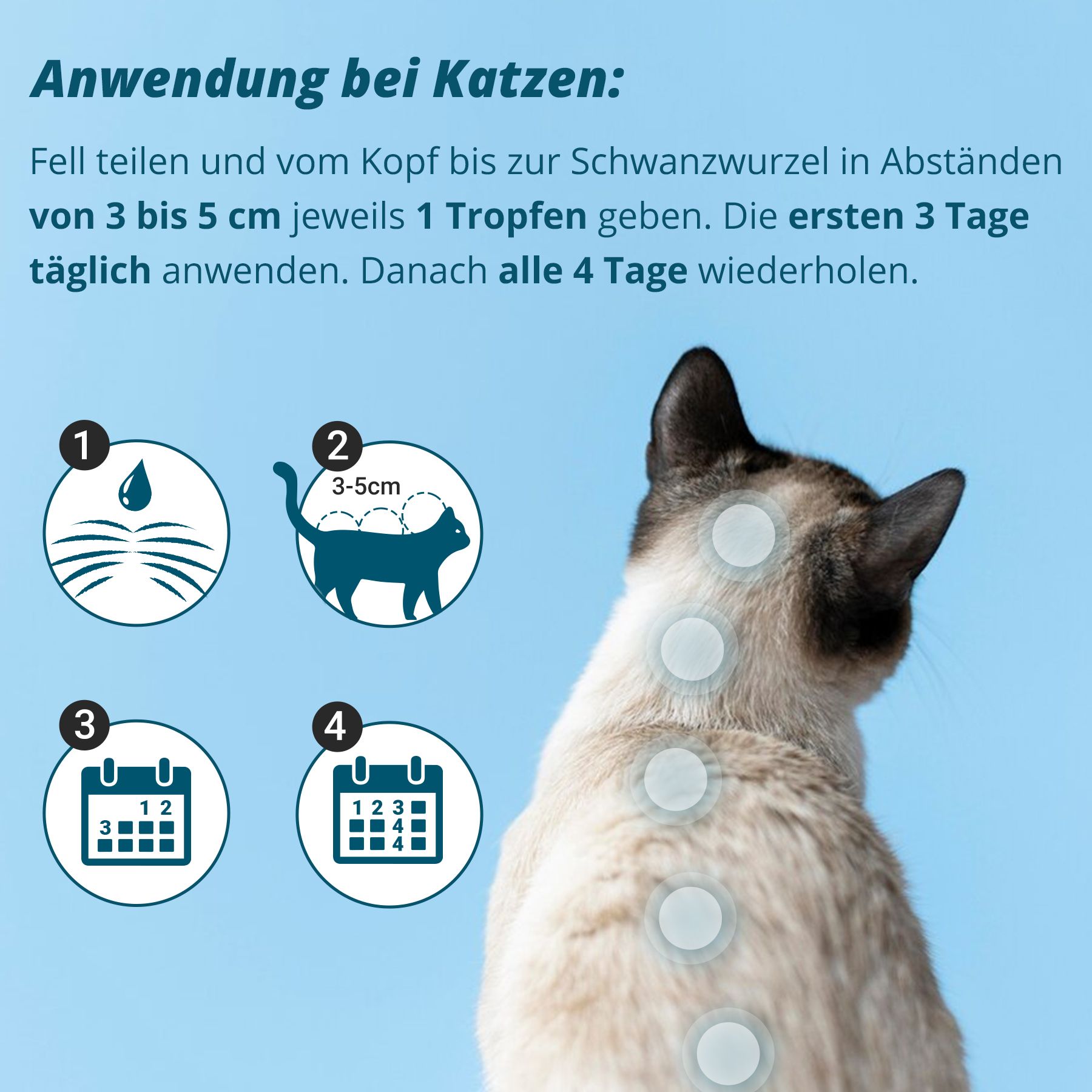 Istruzioni per l'usoApplicazione per gatti: Dividere il pelo e applicare una goccia ogni 3-5 cm dal capo alla radice della coda. Applicare quotidianamente nei primi 3 giorni. Poi ripetere ogni 4 giorni.