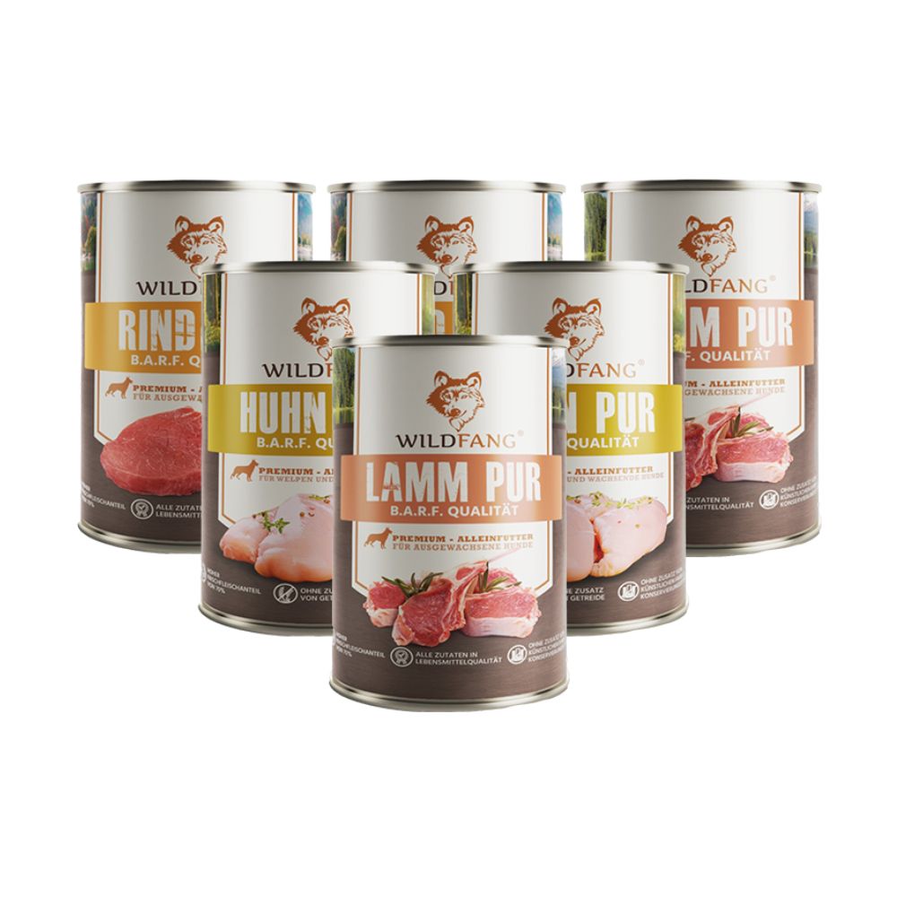 Il nostro cibo umido Wildfang® Premium Pure è ideale come alimento completo per il tuo cane adulto e si distingue per la sua esclusiva qualità B.A.R.F. L'ingrediente principale funge da deliziosa fonte proteica, fornisce al tuo cane tutti i nutrienti essenziali, è ricco di aminoacidi e ha un basso contenuto di grassi. Essendo privo di cereali, il nostro cibo umido è particolarmente digeribile e può quindi essere somministrato anche a cani con intolleranza ai cereali. Alimento completo per cani adulti. Contenuto per 2 varietà: 3 lattine da 800 g per ciascuna varietà. Contenuto per 3 varietà: 2 lattine da 800 g per ciascuna varietà. Caratteristiche principali in sintesi: Una vera delizia per il tuo amico a quattro zampe: questo alimento completo di alta qualità per cani offre al tuo cane una dieta sana ed equilibrata, dal sapore delizioso. Pure prelibatezze: il cibo umido di qualità B.A.R.F. ha un elevato contenuto di carne del 70% ed è composto esclusivamente da carne muscolare e frattaglie di alta qualità, come cuore, fegato, polmoni e trippa. Il benessere del tuo cane è la nostra massima priorità, ecco perché evitiamo completamente coloranti e conservanti artificiali, così come cereali e zuccheri aggiunti. Come posso riconoscere un buon cibo umido per cani? 1. Alto contenuto di carne di almeno il 60% ✅ Wildfang® supera questo con il 70% 2. Dichiarazione trasparente degli ingredienti ✅ Wildfang® soddisfa questo 3. Nessun additivo come latte, soia, zucchero, coloranti e aromi artificiali, esaltatori di sapidità e sottoprodotti ✅ Wildfang® soddisfa questo 4. Senza cereali o glutine ✅ Wildfang® soddisfa questo 5. Contenuto di proteine grezze tra l'8 e il 12% ✅ Wildfang® supera questo con l'11% 6. Contenuto di grassi grezzi tra il 4 e il 6% ✅ Wildfang® supera questo con l'8% 7. Contenuto di ceneri grezze tra l'1 e il 3% ✅ soddisfa Wildfang® con il 2% 8. Contenuto di fibre grezze 0,5 - 1% ✅ soddisfa Wildfang® ancora meglio con lo 0,4%