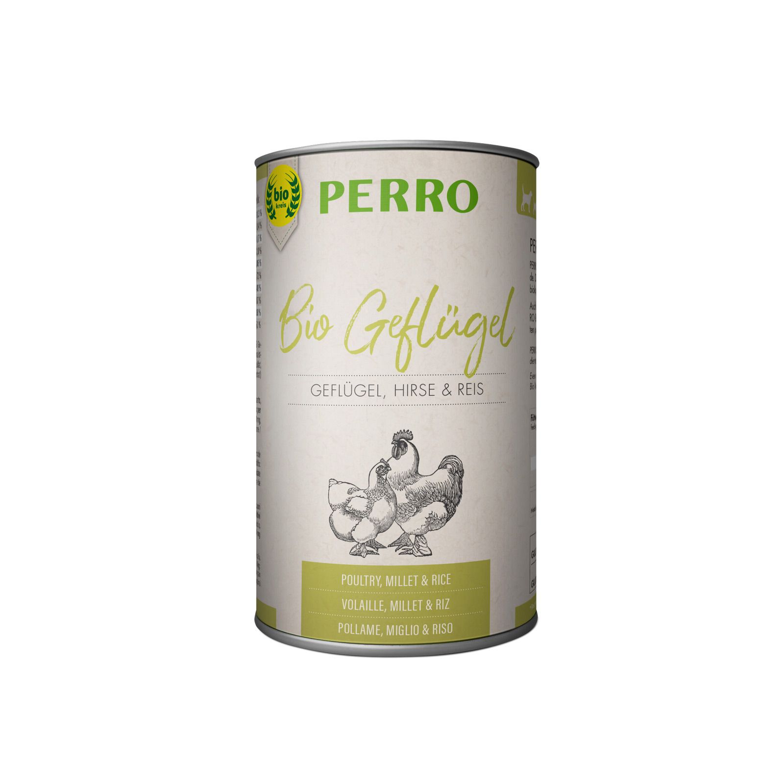 PERRO Bio Pollo, Miglio e Riso è un alimento umido di alta qualità per cani. Tutti gli ingredienti utilizzati provengono da agricoltura biologica certificata, da filiere regionali e sono naturalmente privi di OGM. I nostri fornitori selezionati rispettano pienamente tutte le normative sul benessere animale in materia di allevamento, mantenimento e macellazione.
