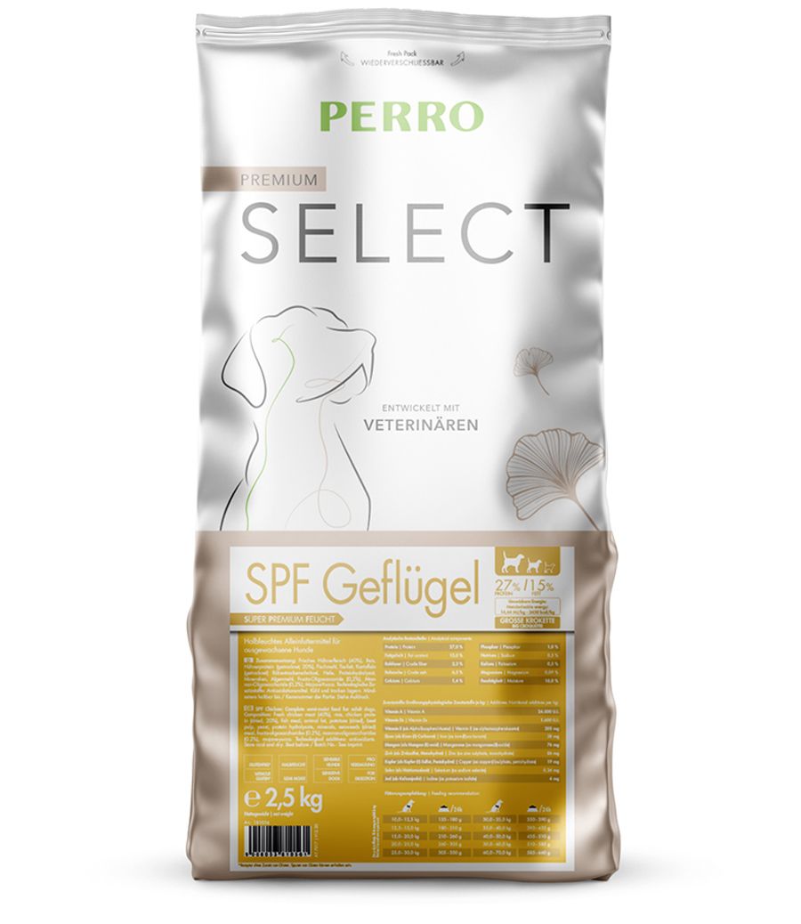 Per i cani adulti di taglia grande con esigenze particolari in fatto di gusto, tollerabilità e digeribilità, PERRO Select Super Premium Feucht (SPF) Pollame è la scelta ideale.